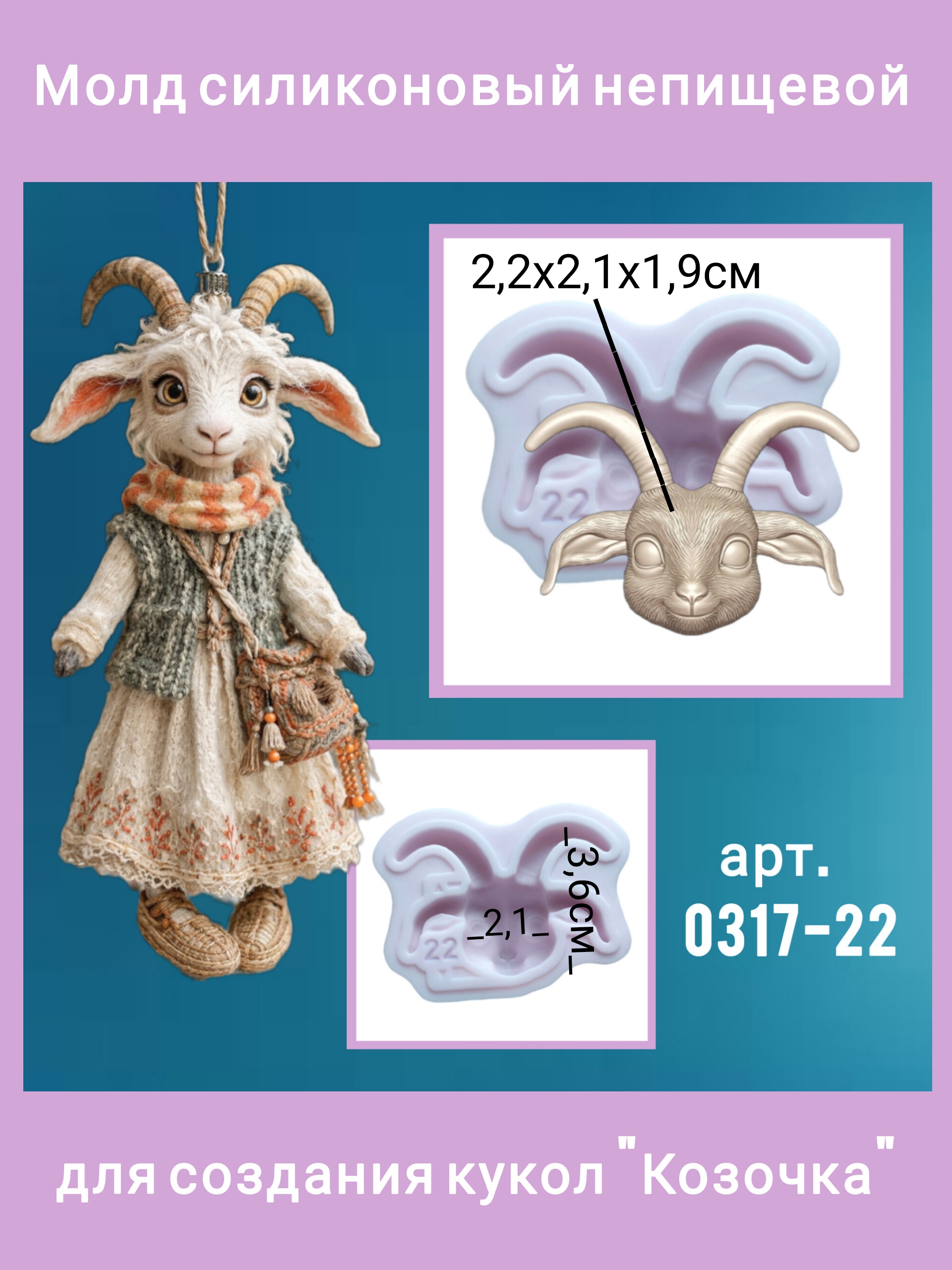 Авторский силиконовый молд "Козочка". Высота мордочки без учёта рогов 2,2 см. Производство Россия. РОСиТТА.